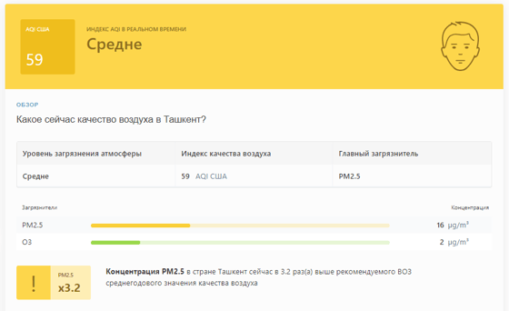 В 09:05 станция мониторинга в столице Узбекистана показывала результат в 59 AQI. Концентрация PM2.5 — в 3,2 раза выше рекомендуемого ВОЗ среднегодового значения качества воздуха.
