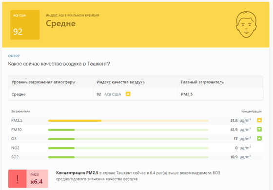 В 09:05 станция мониторинга в столице Узбекистана показывала результат в 92 AQI. Концентрация PM2.5 — 6,4 раза выше рекомендуемого ВОЗ среднегодового значения качества воздуха.