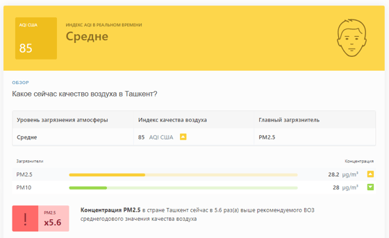 В 08:25 станция мониторинга в столице Узбекистана показывала результат в 85 AQI. Концентрация PM2.5 — в 5,6 раза выше рекомендуемого ВОЗ среднегодового значения качества воздуха.