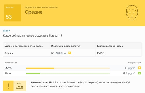 В 12:00 станция мониторинга в столице Узбекистана показывала результат в 53 AQI. Концентрация PM2.5 — в 2,6 раза выше рекомендуемого ВОЗ среднегодового значения качества воздуха.