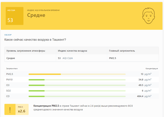 В 10:05 станция мониторинга в столице Узбекистана показывала результат в 53 AQI. Концентрация PM2.5 — в 2,6 раза выше рекомендуемого ВОЗ среднегодового значения качества воздуха.