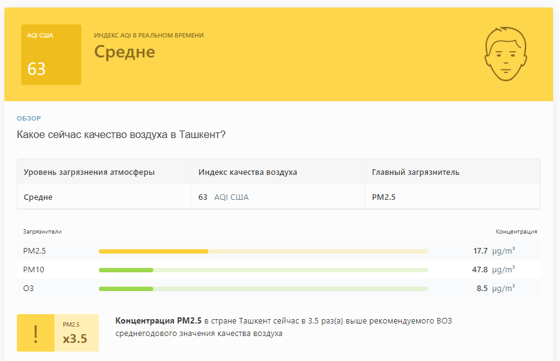 В 08:55 станция мониторинга в столице Узбекистана показывала результат в 63 AQI. Концентрация PM2.5 — в 3,5 раза выше рекомендуемого ВОЗ среднегодового значения качества воздуха.