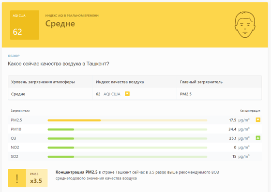 В 09:25 станция мониторинга в столице Узбекистана показывала результат в 62 AQI. Концентрация PM2.5 — в 3,5 раза выше рекомендуемого ВОЗ среднегодового значения качества воздуха.