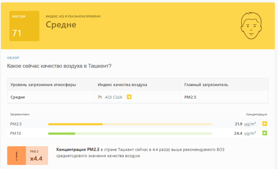 В 08:30 станция мониторинга в столице Узбекистана показывала результат в 71 AQI. Концентрация PM2.5 — в 4,4 раза выше рекомендуемого ВОЗ среднегодового значения качества воздуха.