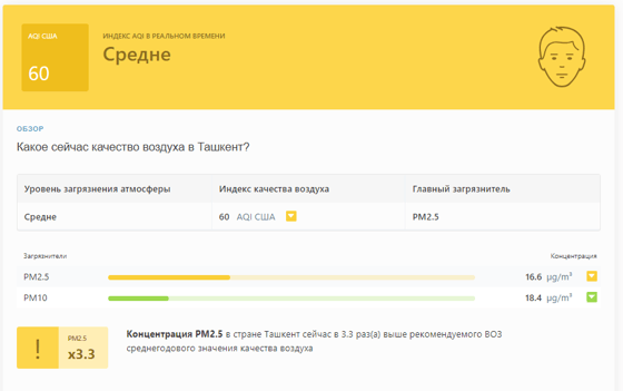 В 09:40 станция мониторинга в столице Узбекистана показывала результат в 60 AQI. Концентрация PM2.5 — в 3,3 раза выше рекомендуемого ВОЗ среднегодового значения качества воздуха.