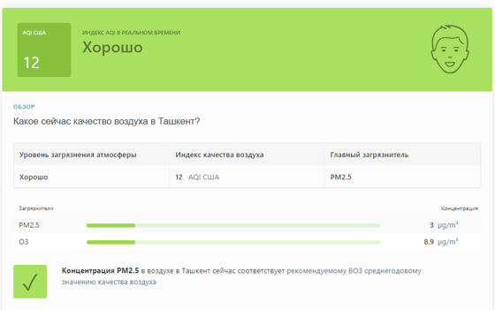 В 09:16 станция мониторинга в столице Узбекистана показывала результат в 12 AQI. Концентрация PM2.5 соответствует рекомендуемому ВОЗ среднегодовому значению качества воздуха.