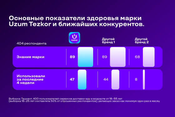 За этот год Uzum Tezkor стал одним из лидеров по узнаваемости среди пользователей в столиц. В Ташкенте мы провели исследование среди 400 пользователей сервисов доставки еды в возрасте от 18–55 лет, (выборка 18–25 лет составляла 50% от опрошенных респондентов), делающих заказ как минимум один раз в месяц. И по его результатам, 9 из 10 респондентов знают бренд, а 47% — делали заказ в Uzum Tezkor в течение последнего месяца. Также участники исследования считают, что Uzum Tezkor лучше других понимает традиции и привычки узбекистанцев, — отмечает директор исследовательского агентства RGCA Вячеслав Карпов.