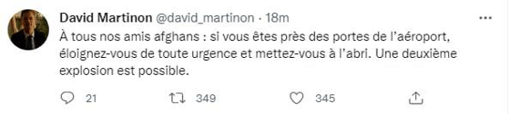 Всем нашим афганским друзьям: если вы недалеко от ворот аэропорта, держитесь подальше на всякий случай. Может произойти и второй взрыв,