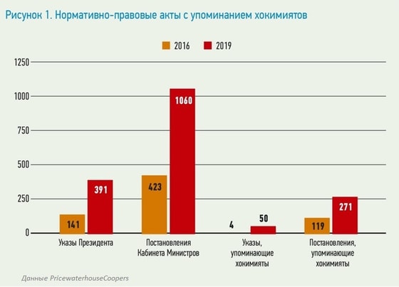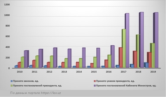 Среднегодовое количество принятых законов в 2017-2020 годах превысило аналогичный показатель 2010-2016 годов в 2,5 раза; число указов президента – в 2,9 раза; постановлений президента – в 2,7 раза; постановлений правительства – в 2,7 раза.
