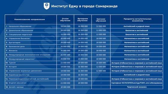 С факультетами, стоимостью обучения и предметами вступительных экзаменов в филиале Ёджу в Самарканде можно ознакомиться по картинке ниже.