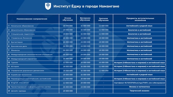 С факультетами, стоимостью обучения и предметами вступительных экзаменов в филиале Ёджу в Намангане можно ознакомиться по картинке ниже.