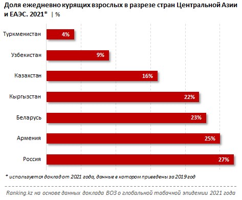 Тем временем доля ежедневно курящих взрослых людей в Кыргызстане составила 22%, в Беларуси — 23%, в Армении — 25%. Самой курящей среди стран ЦА и ЕАЭС оказалась Россия: здесь доля курящих составила 27%.