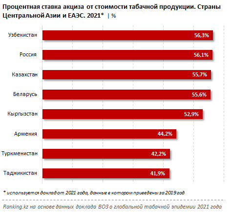 В свою очередь, в Беларуси процентная ставка акциза от стоимости табачной продукции составила 55,6%, в Кыргызстане — 52,9%, в Армении — 44,2%.