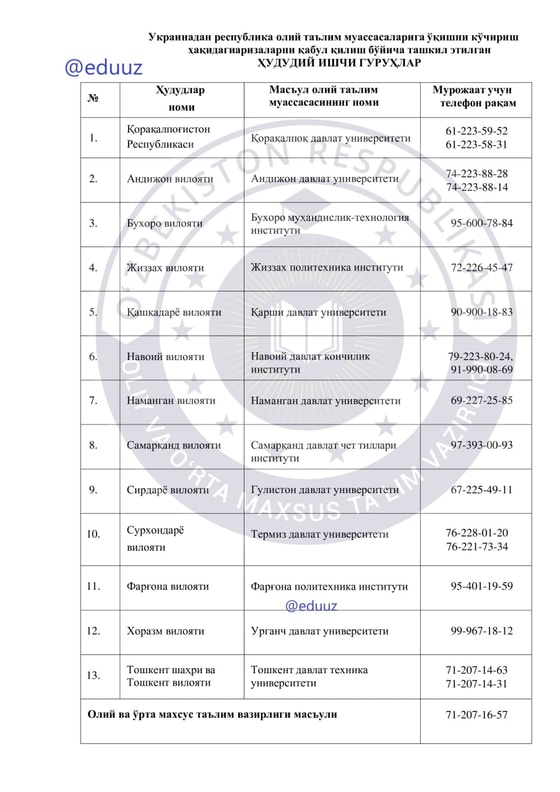 В соответствии с поручением, данным на состоявшемся 4 марта видеоселекторном совещании под председательством Шавката Мирзиеева, документы студентов, желающих вернуться из Украины и продолжить обучение в Узбекистане, принимаются территориальными рабочими группами.