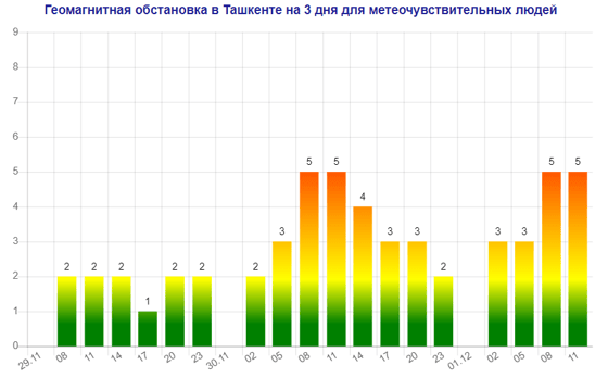 Послезавтра (1 декабря) в Ташкенте ожидается магнитная буря мощностью пять баллов, следует из данных сервиса Meteonova.