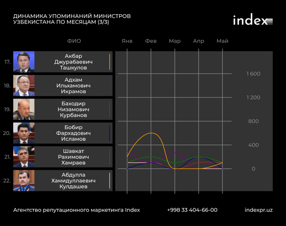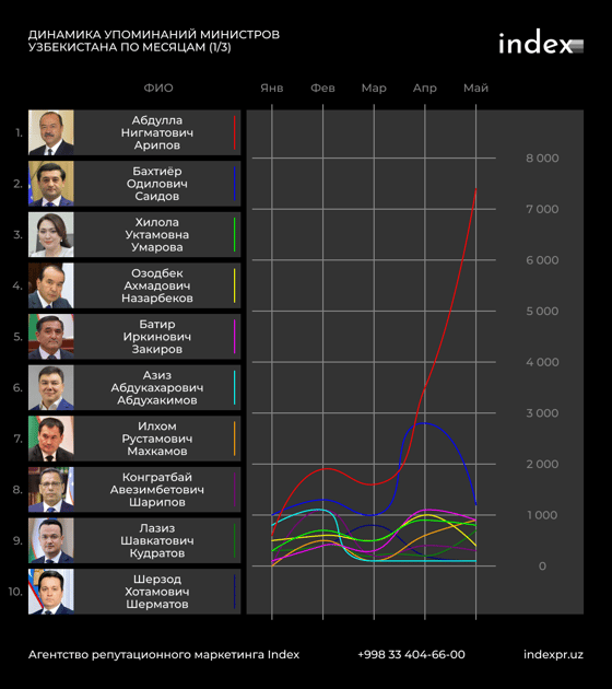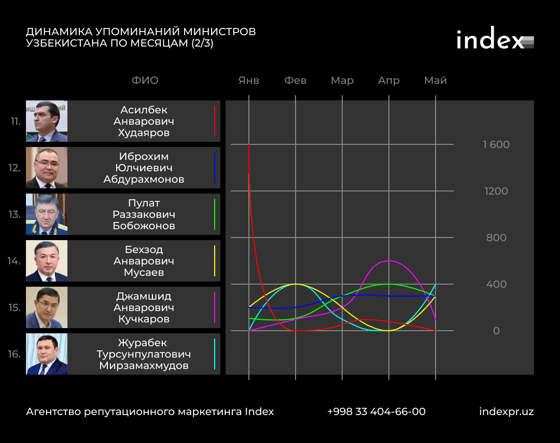 Показательно, что в топ-10 рейтинга также вошли Хилола Умарова, Озодбек Назарбеков, Батир Закиров, Азиз Абдухакимов, Ильхом Махкамов, Конгратбай Шарипов, Лазиз Кудратов, Шерзод Шерматов. Это говорит о преобладании в общественном инфополе тематик образования, культуры, экологии и охраны окружающей среды, строительства, транспорта, инвестиций и развития промышленности, IT и телекоммуникаций.