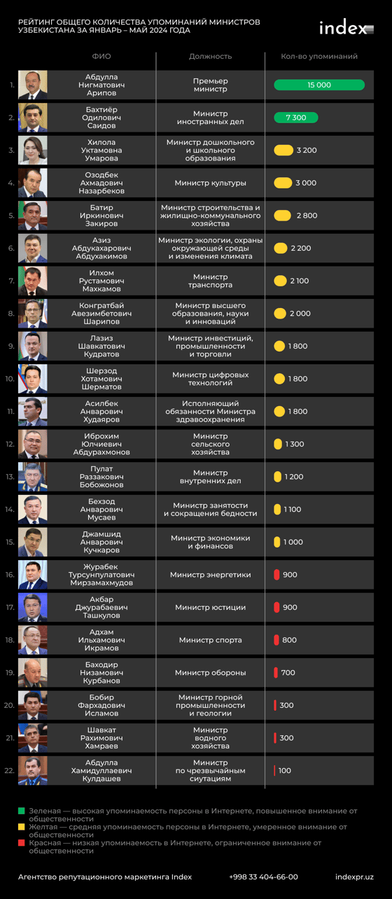 Высокая частота упоминаний министров в медиа отражает не только их активную работу, но и внимание общественности к деятельности правительства. Особое значение имеет позитивный характер упоминаний, что влияет на общую репутацию ведомств и самих чиновников, — Жасур Пулатов, PR-директор агентства Index.