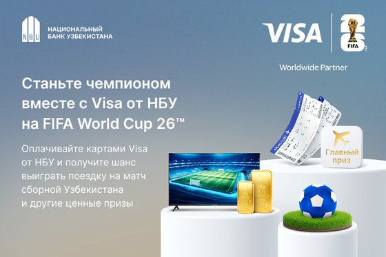 С 1 февраля оплачивайте покупки картой Visa от Национального банка Узбекистана и участвуйте в акции в рамках FIFA World Cup 26™. Каждая транзакция приближает вас к возможности выиграть главный приз.